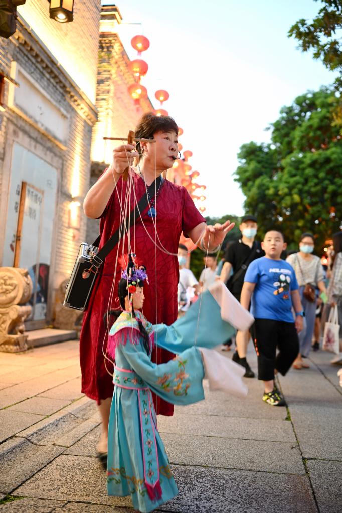 7月11日,在福州三坊七巷历史文化街区南后街,艺人在进行提线木偶表演。新华社记者姜克红摄