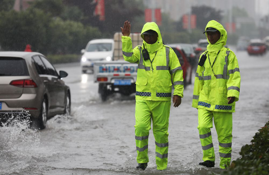 7月20日,河南省武陟县公安局交警大队民警在积水路段指挥车辆通行。新华社发(冯小敏 摄)