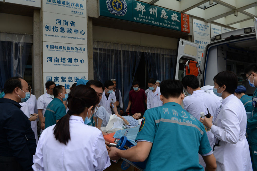 在郑州大学第一附属医院,整个河医院区从20日傍晚开始断电,大约600名重症患者生命安全受到威胁。21日凌晨1点左右,记者步行至医院门诊部,水深过腰,院内很多车辆泡在水中;门诊楼前、高架桥上都有不少人在避雨。截至当天上午,记者在现场了解到,重症病区患者大多数已完成转院,但由于大部分病区仍未恢复供电,门诊部已停止接诊。