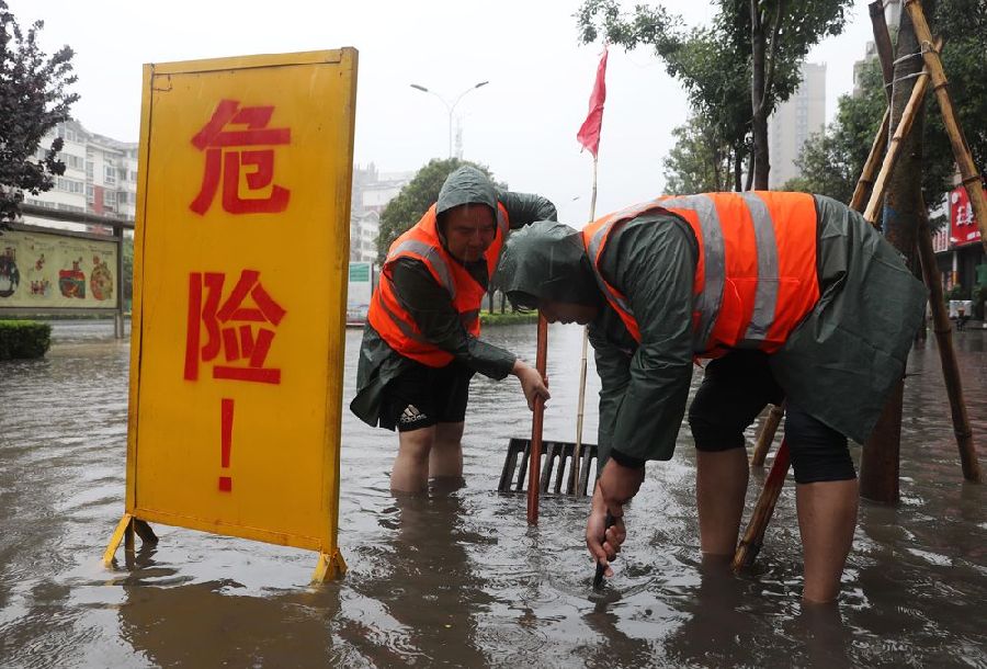 7月20日,河南省武陟县城市管理局工作人员在疏通排水管道。新华社发(冯小敏 摄)