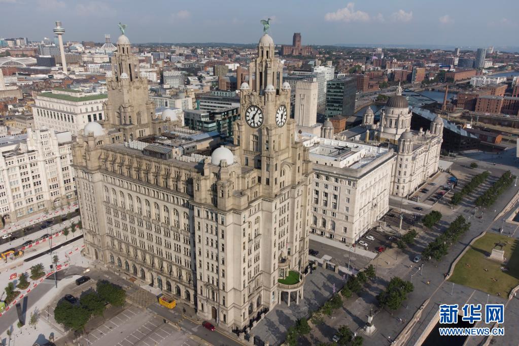 这是7月21日在英国利物浦拍摄的利物浦海上商城码头顶区域(无人机照片)。码头顶最著名的建筑为皇家利物大厦(左)、丘纳德大厦(中)和利物浦港务大厦(右),它们被统称为“美惠三女神”。新华社发(乔恩·休珀摄)