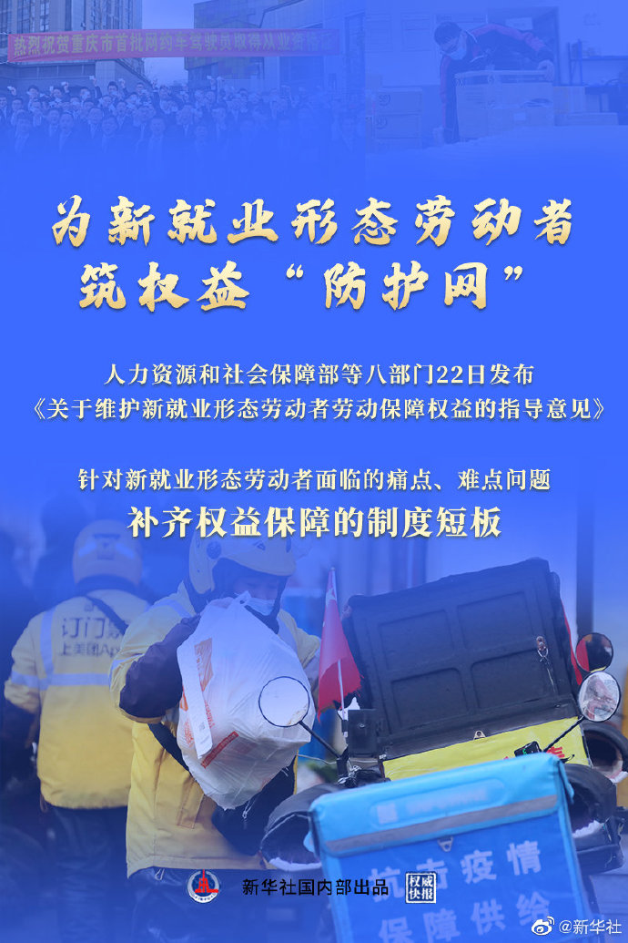 人社部等八部门22日发布《关于维护新就业形态劳动者劳动保障权益的指导意见》首次明确,平台企业对劳动者权益保障应承担相应责任。针对新就业形态劳动者面临的痛点、难点问题,意见从劳动报酬、休息、劳动安全、社会保险等多方面补齐制度短板,并将所有新就业形态劳动者纳入劳动保障基本公共服务范围。(记者姜琳,海报设计杨轶群)