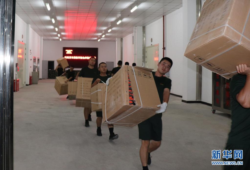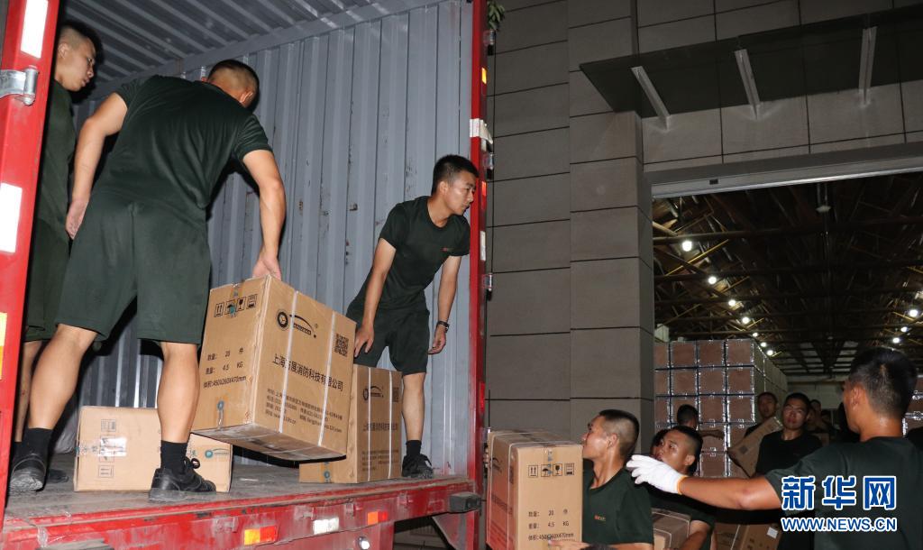 7月21日凌晨,武警部队某仓库组织官兵搬运抢险救灾急需装备。新华社发(王春保 摄)
