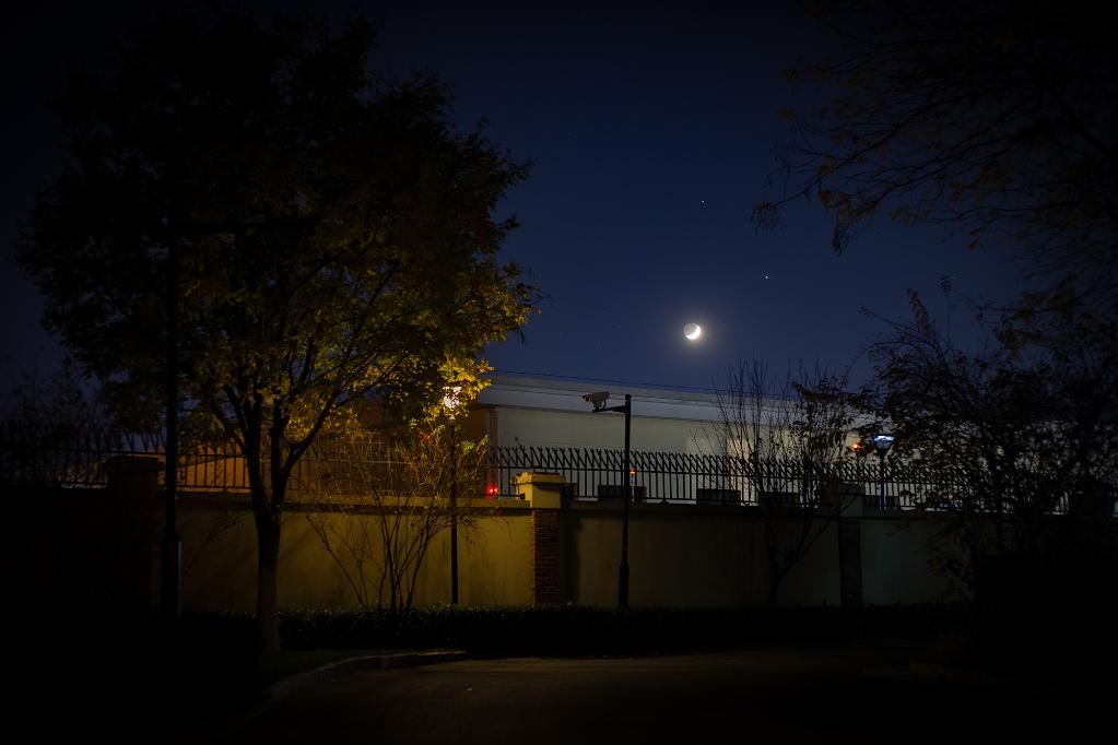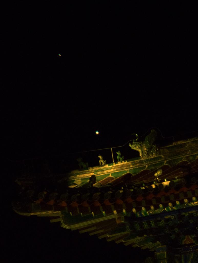 ↑北京市天文爱好者郑志2020年12月17日在故宫角楼拍摄的“土木伴月”。(本人供图)