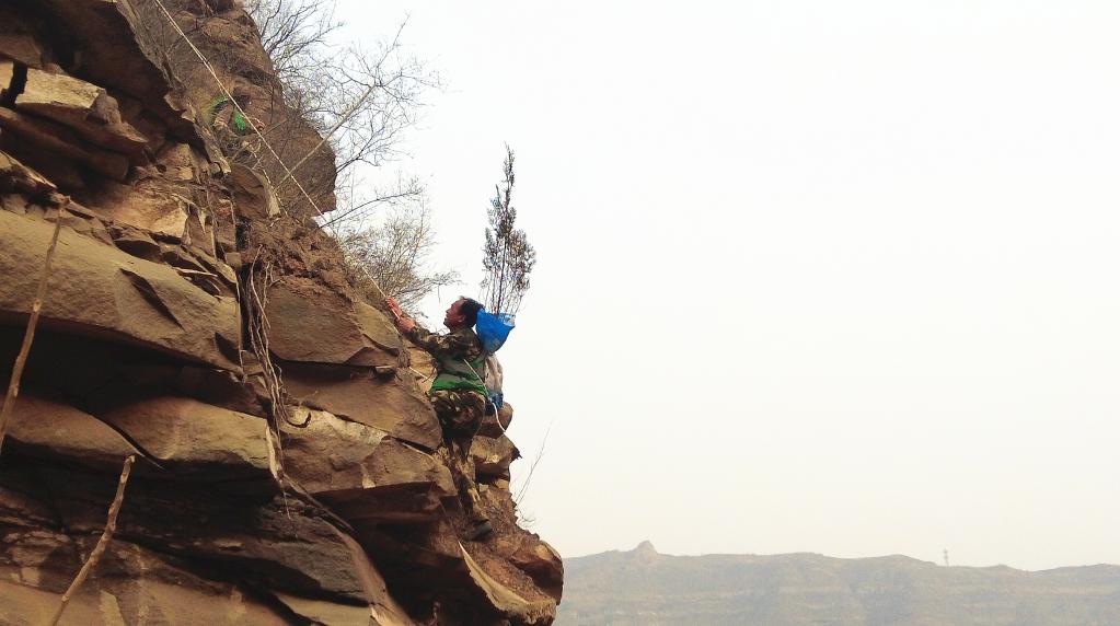 “今年4月的一天,我在壶口瀑布上游右岸一个10多米高的悬崖上种树。当我背着四五公斤重的树苗,用绳子吊着从峭壁上往下顺时,差点儿掉下了悬崖。”