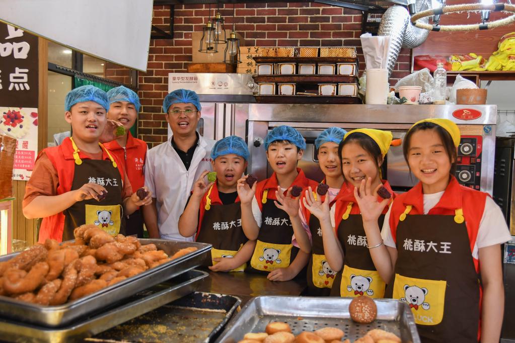 “先熬制糖稀,做好馅料,接下来是做饼皮……”7月22日下午,在山东沂南县辛集镇的一处糕点铺子,“沂蒙小学堂”的学生们正在彭宝灯的指导下,学习着如何做糕点。