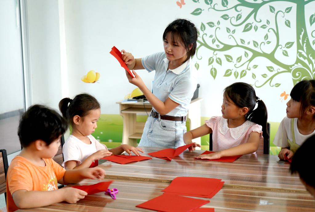 在“沂蒙小学堂”中,学生在支教老师的指导下学习剪纸。(沂南县委宣传部供图)