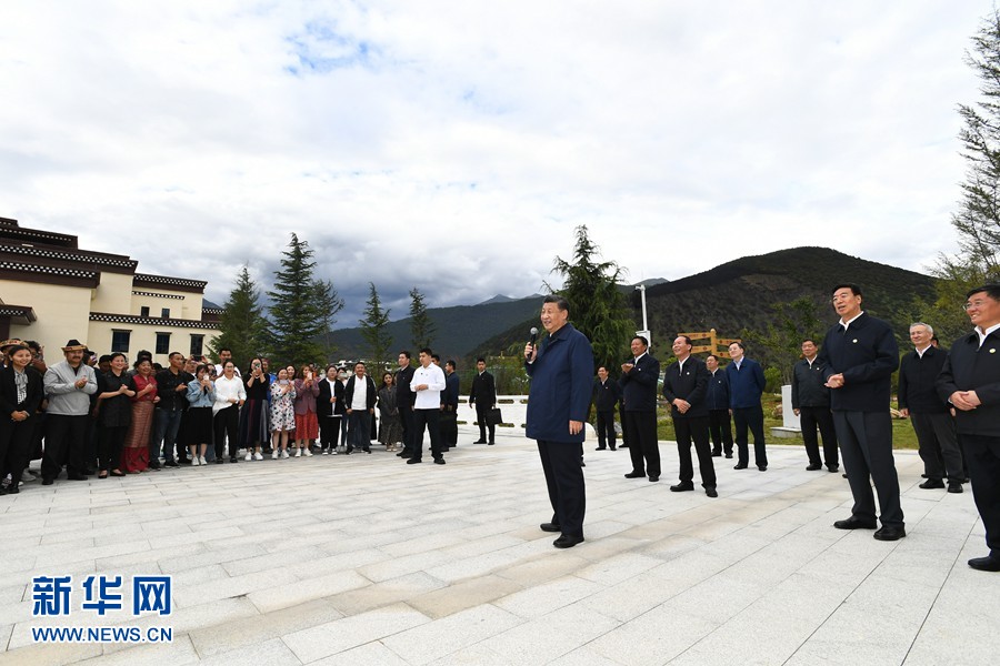 7月21日至23日,中共中央总书记、国家主席、中央军委主席习近平来到西藏,祝贺西藏和平解放70周年,看望慰问西藏各族干部群众。这是21日下午,习近平在林芝市巴宜区林芝镇嘎拉村考察时,向村民们挥手致意。 新华社记者 李学仁 摄