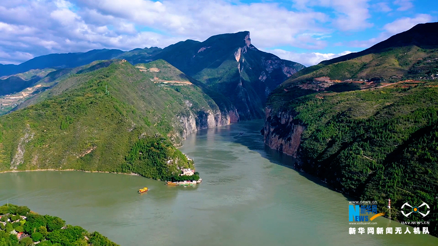 无人机视角下的夏日瞿塘峡。新华网发(王强 摄)