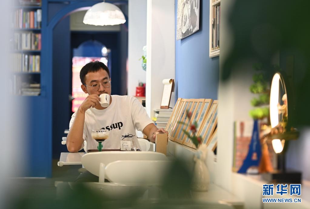 7月8日,咖啡爱好者在泉州市鲤城区金鱼巷内的“德兰·书”咖啡文化展示中心品尝咖啡。新华社记者 林善传 摄