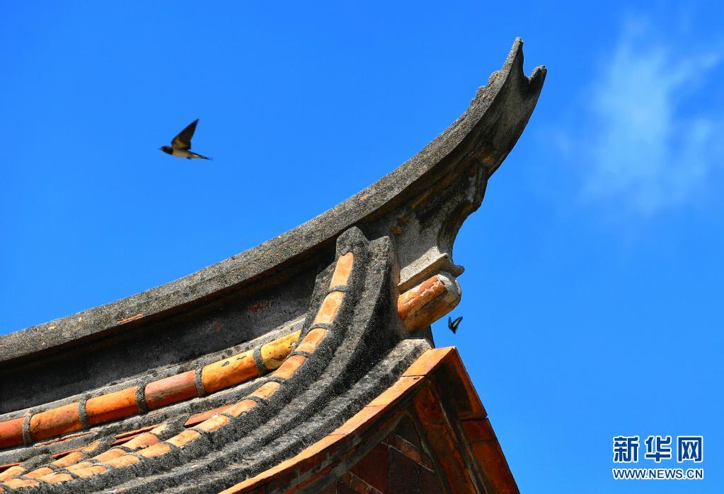 7月8日,燕子和蝴蝶飞过福建泉州晋江古石桥安平桥桥头的燕尾脊。新华社记者 魏培全 摄