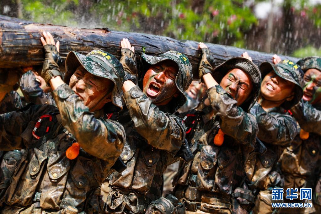 陆军第83集团军某旅“红一连”战士江诗意(左二)参加旅教导队集训(5月6日摄)。新华社发(姜东坡 摄)