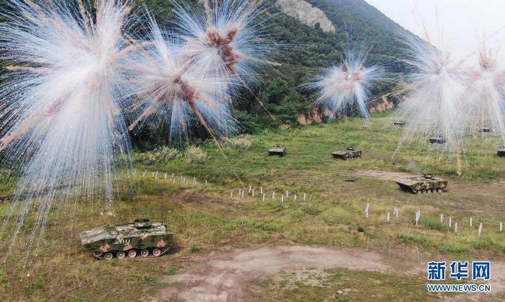 对抗演练中,陆军第83集团军某旅“红一连”某型步战车利用烟幕掩护,向“敌”阵地发起冲击(7月4日摄)。新华社记者 张永进 摄