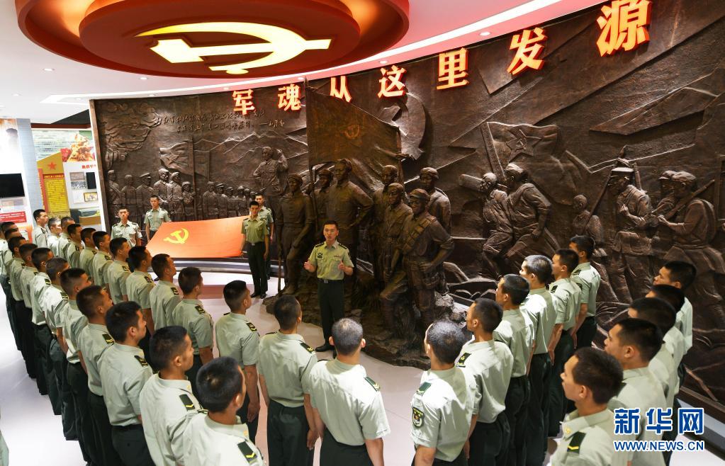 在陆军第83集团军某旅“红一连”连史馆“军魂从这里发源”雕塑前,指导员郑纪文(中)为官兵讲述“支部建在连上”的光荣历史(7月4日摄)。新华社记者 张永进 摄