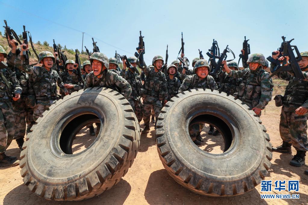 陆军第83集团军某旅“红一连”官兵在训练间隙开展翻轮胎比赛(2020年5月1日摄)。新华社发(姜东坡 摄)