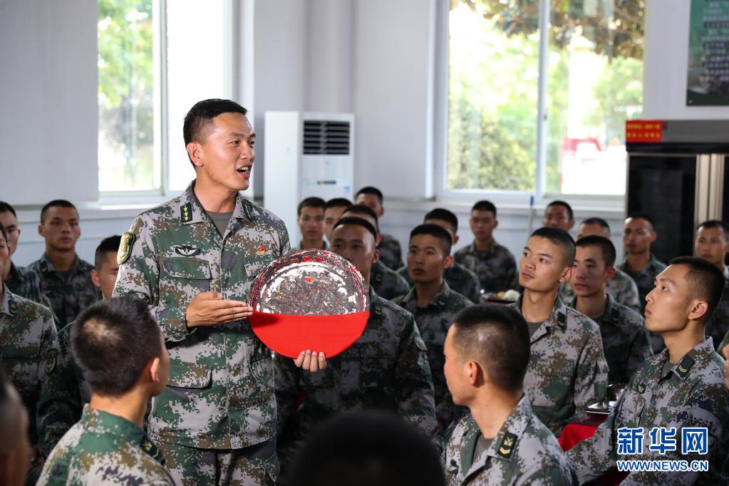 党史学习教育中,陆军第83集团军某旅“红一连”指导员郑纪文为官兵讲述连队传家宝“红菜盘”背后的故事(6月13日摄)。新华社发(姜东坡 摄)