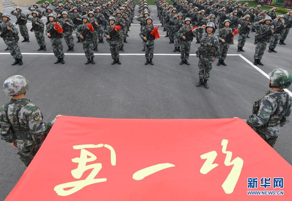 陆军第83集团军某旅“红一连”为新战士授枪后,全连官兵在连队荣誉旗前宣誓(7月4日摄)。新华社记者 张永进 摄