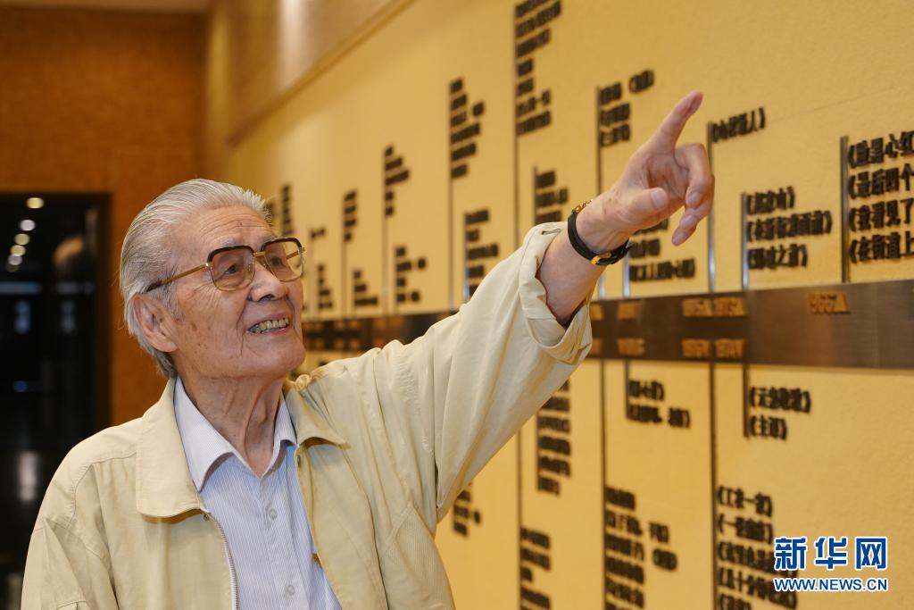 蓝天野在北京人民艺术剧院戏剧博物馆向记者指出曾出演的剧目(6月16日摄)。新华社发(缑宇 摄)