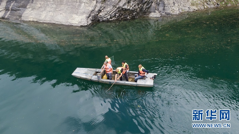 近日,持续降雨导致水面漂浮物增多,谭大凡和建始县水利局工作人员清理水面。