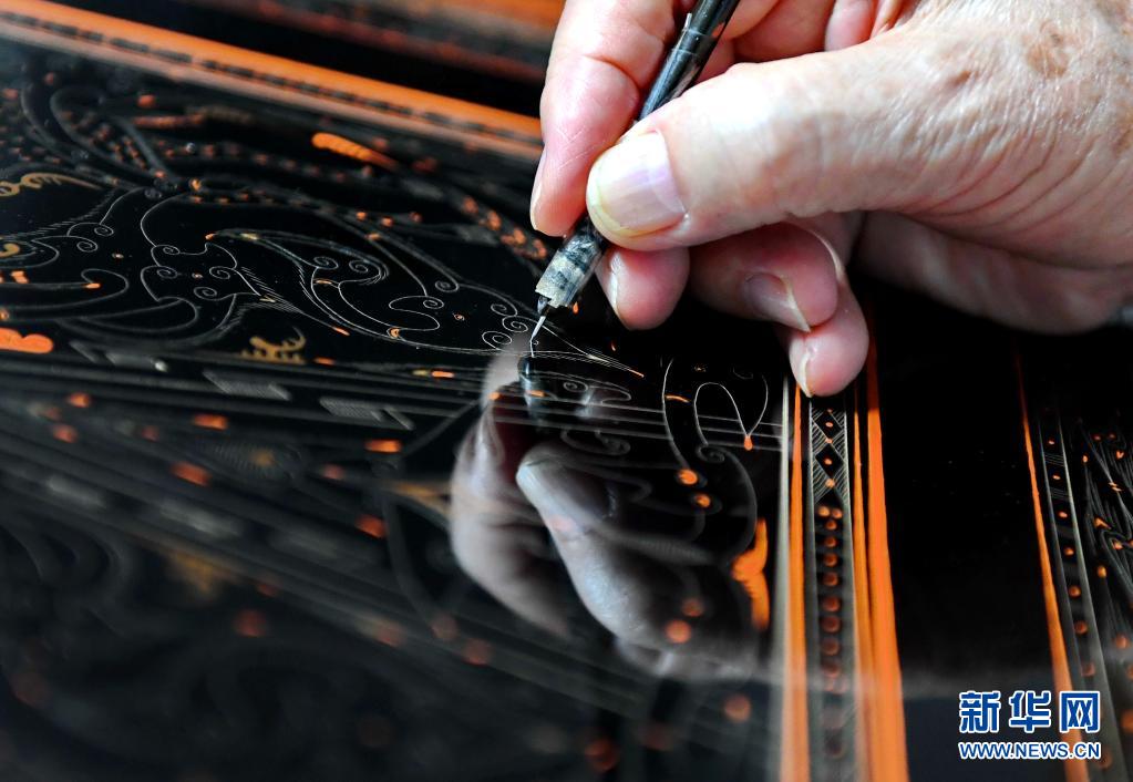 7月23日,中国工艺美术大师、国家级非物质文化遗产项目福州脱胎漆器髹饰技艺的代表性传承人郑修钤展示漆艺针刻技法。