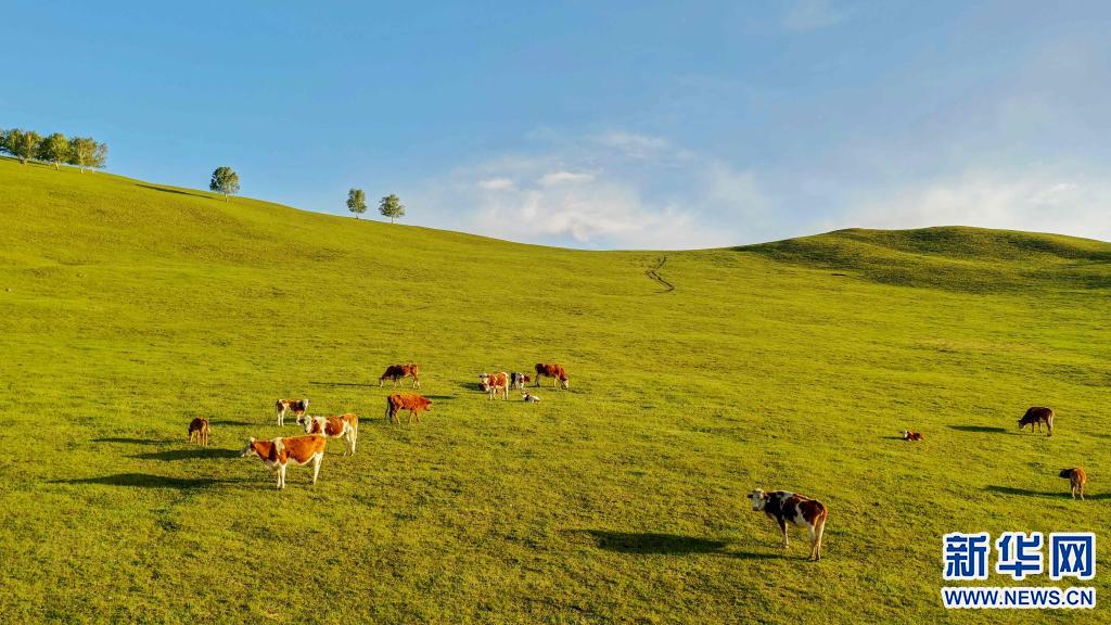 牛儿在乌兰毛都草原上悠闲地吃草。新华网 发(赖志强 摄)