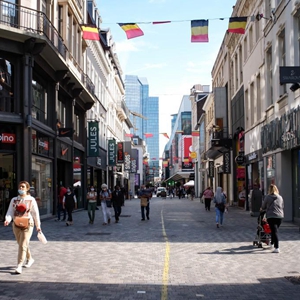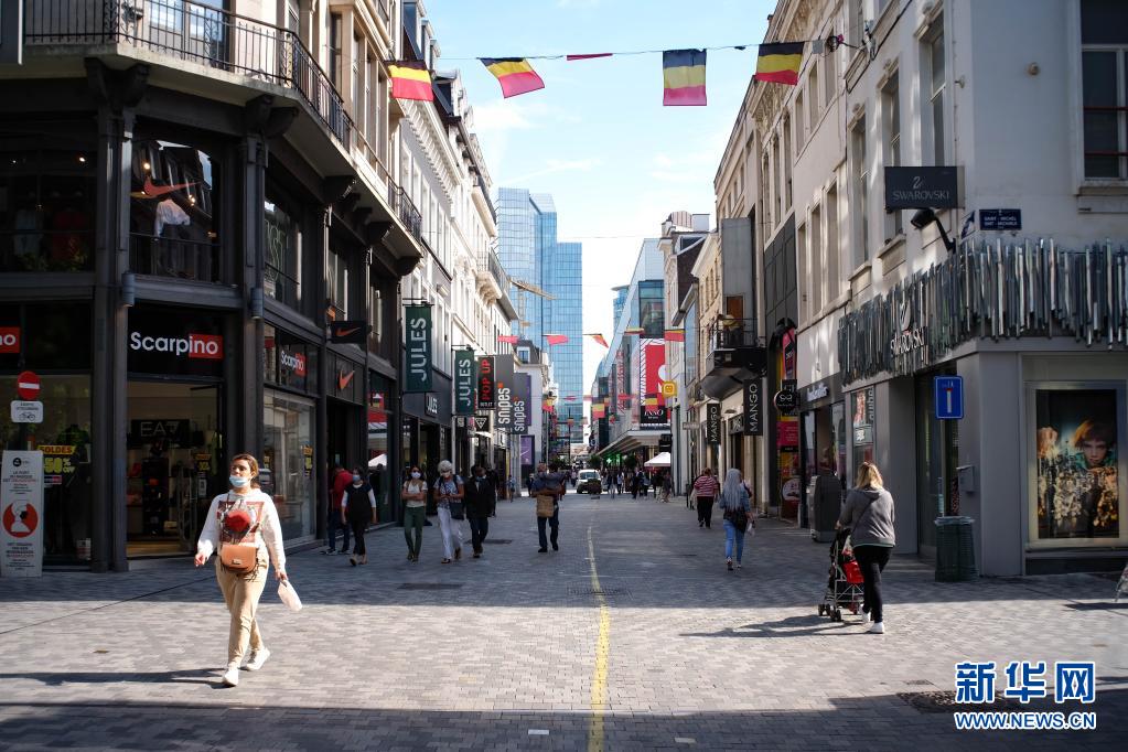 7月30日,人们走在比利时布鲁塞尔的一条商业街上。新华社记者 张铖 摄