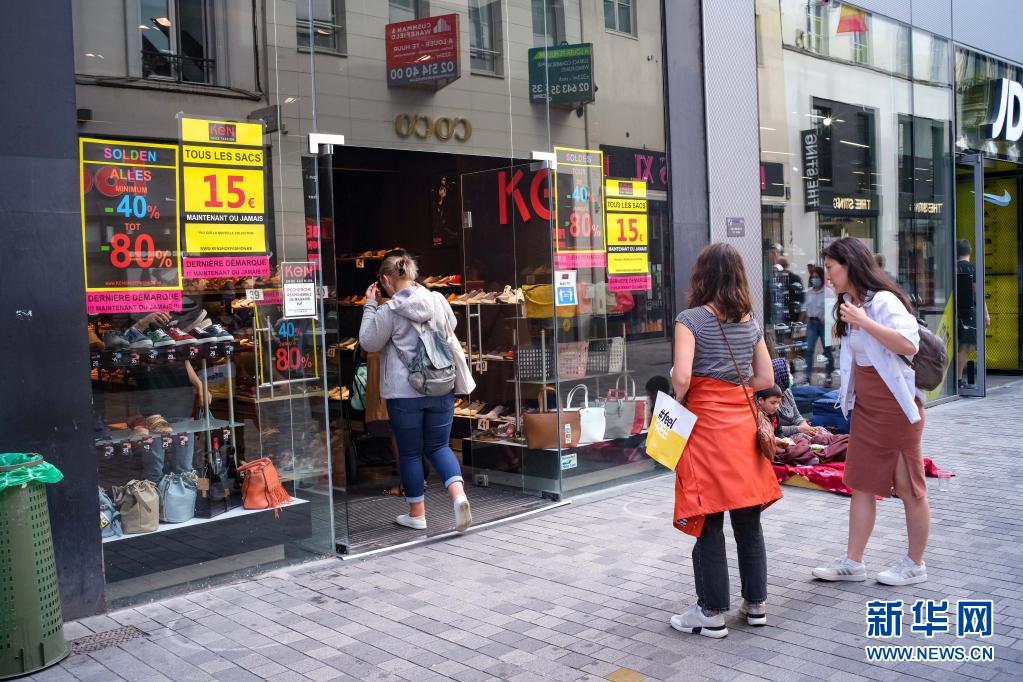 7月30日,人们进入比利时布鲁塞尔一家正在进行促销活动的商店。新华社记者 张铖 摄