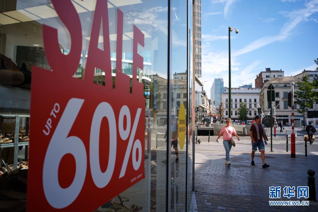 7月30日,人们走过比利时布鲁塞尔一家正在进行促销活动的商店。新华社记者 张铖 摄