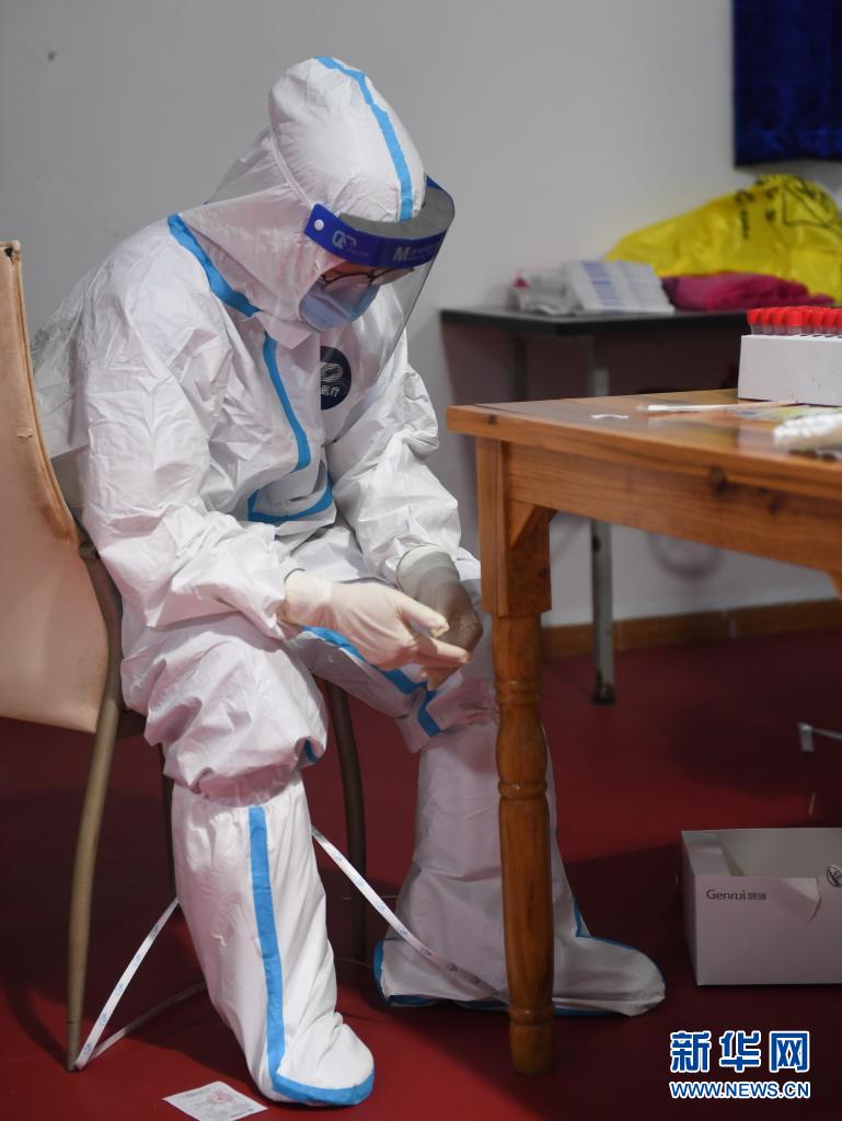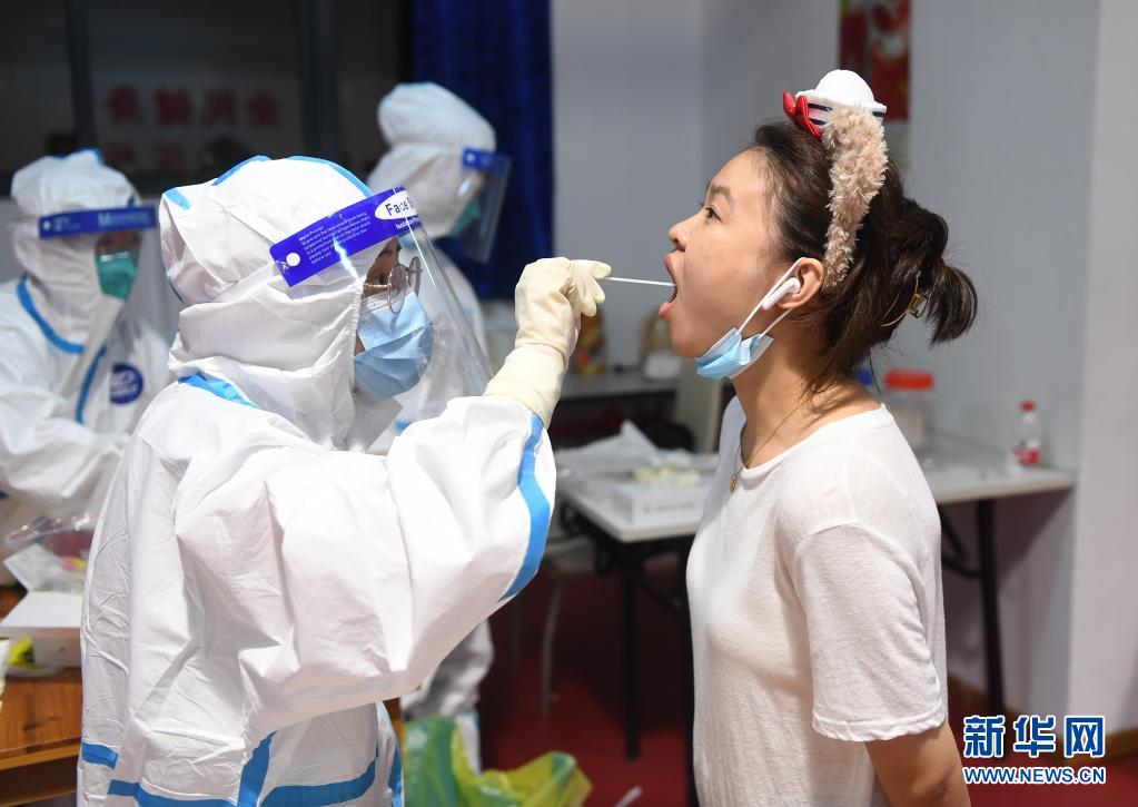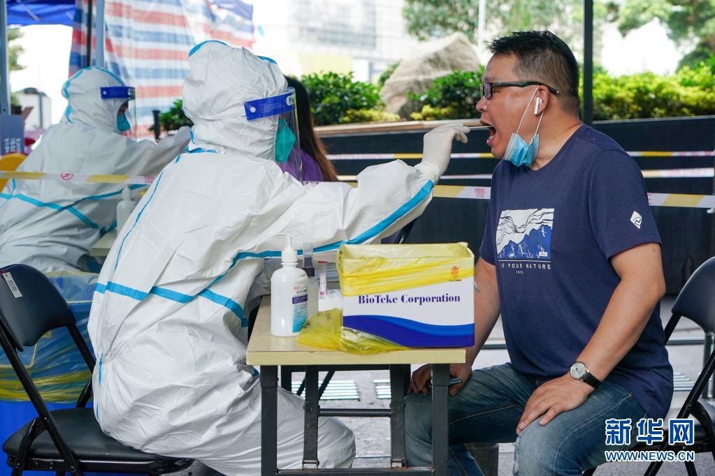 7月21日,在南京市江宁区万科·金域蓝湾小区核酸检测点,江苏省中西医结合医院医生张勇在为居民进行核酸检测取样。新华社记者 季春鹏 摄