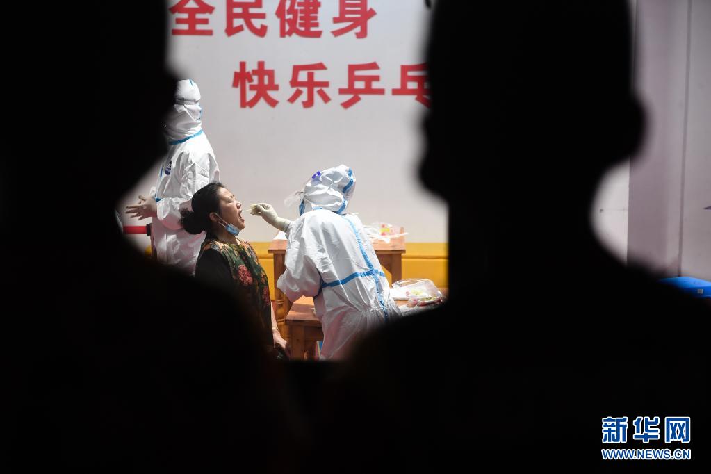7月24日晚,在南京江宁区高尔夫国际花园小区检测点,医务人员在为居民进行核酸检测取样。新华社记者 季春鹏 摄