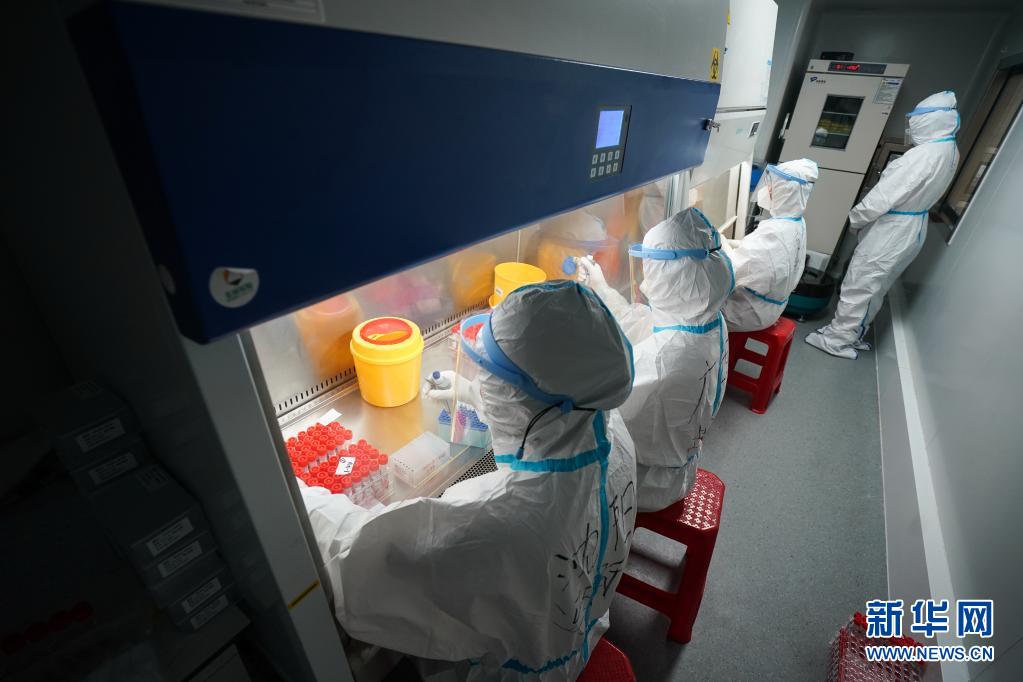 7月27日,在南京火车站站前广场,工作人员在金域医学“猎鹰号”移动方舱实验室内检测核酸样本。新华社记者 季春鹏 摄