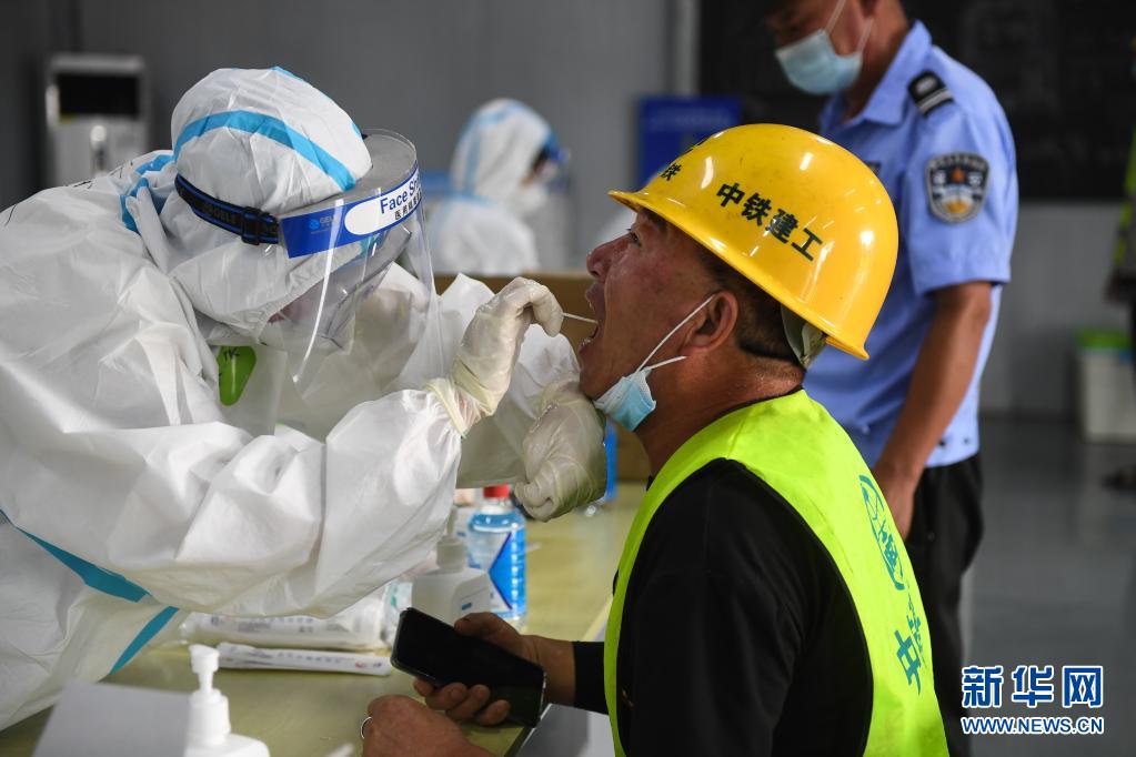 7月29日,在中铁建工集团南京无线谷项目部核酸检测点,建筑工人在接受核酸检测取样。新华社记者 季春鹏 摄