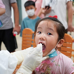 在南京市江宁区龙西社区核酸检测点,一名小朋友在接受核酸检测取样(7月24日摄)。新华社记者 李博 摄