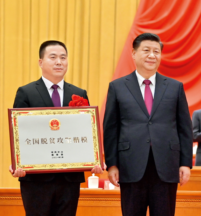 ▲ 2月25日,全国脱贫攻坚总结表彰大会在北京人民大会堂隆重举行。这是习近平为全国脱贫攻坚楷模荣誉称号获得者宁夏回族自治区永宁县闽宁镇颁奖 李学仁摄/ 本刊