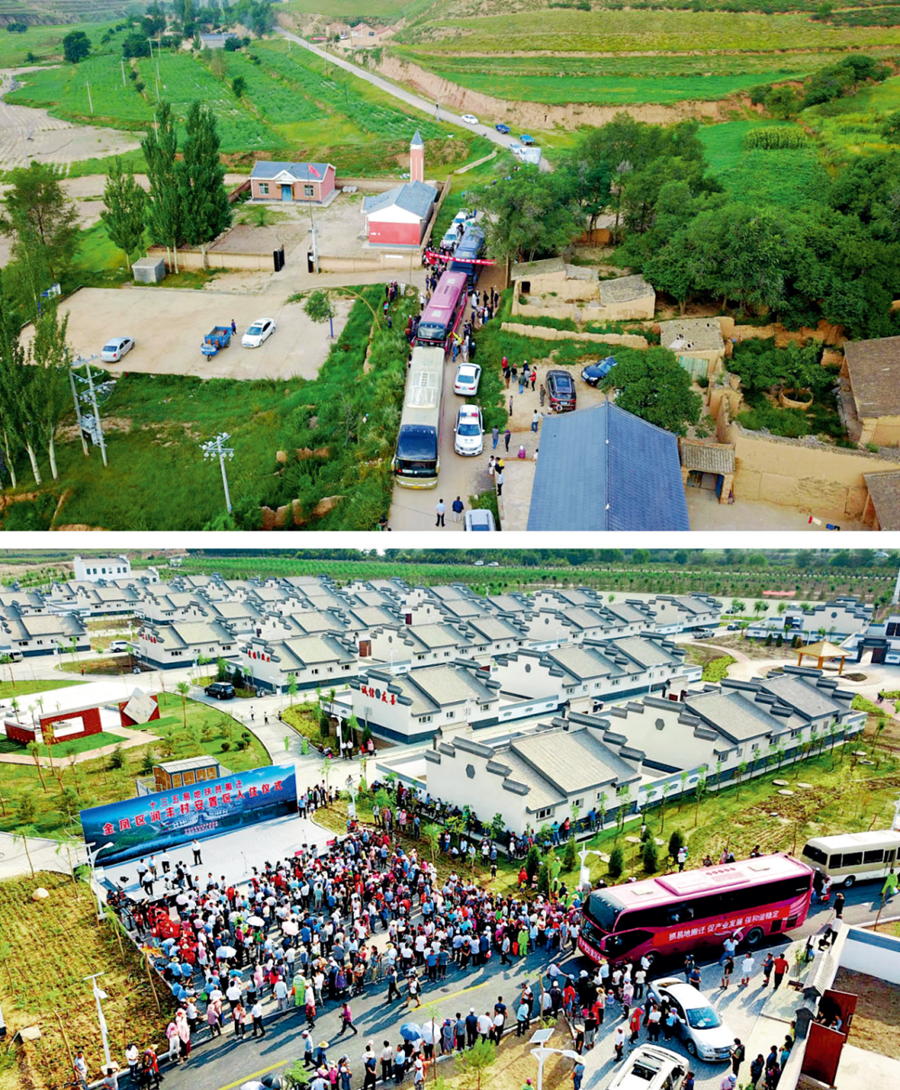 ▲ 上图为宁夏西吉县白崖乡半子沟村村民准备集体搬迁至宁夏银川市金凤区润丰村。下图为银川市金凤区润丰村迎来首批138 户移民入住,来自半子沟村的群众统一乘坐大巴搬出大山,来移民新村开始新生活(2017 年8月17日摄) 王鹏摄/ 本刊