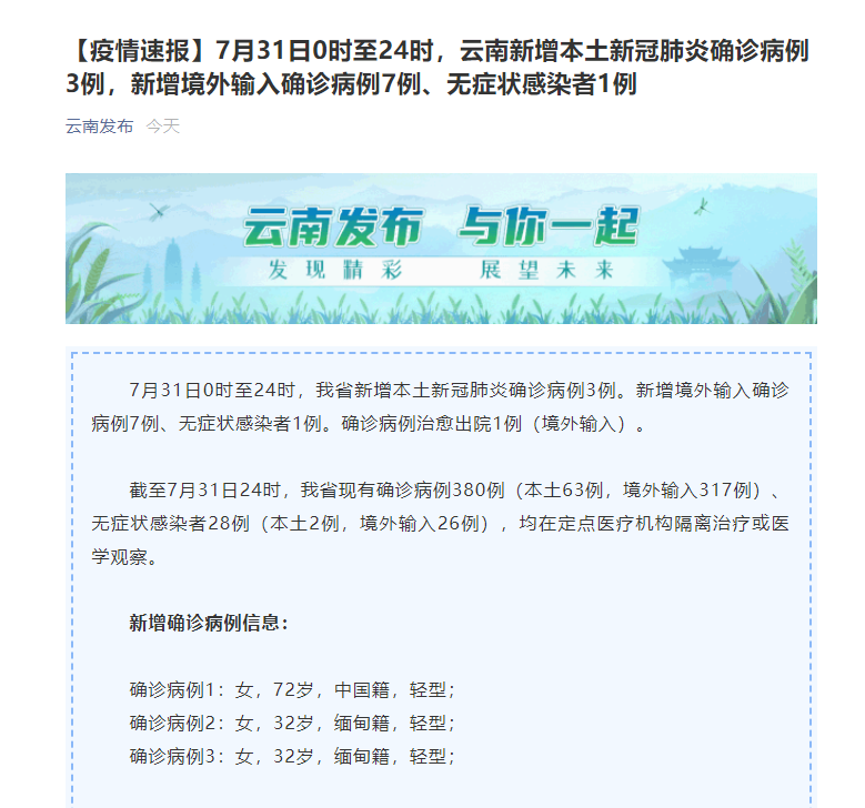 【疫情速报】7月31日0时至24时,云南新增本土新冠肺炎确诊病例3例,新增境外输入确诊病例7例、无症状感染者1例