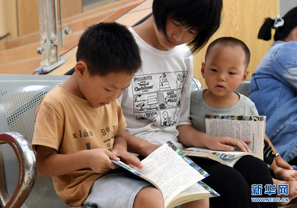 7月30日,在鹤壁市浚县科达中学安置点,转移群众在图书馆内看书。