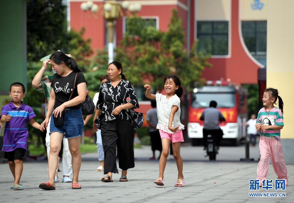 7月30日,在鹤壁市浚县科达中学安置点,转移群众在校园内活动。