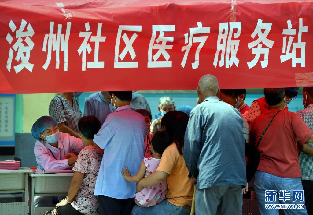 7月30日,在鹤壁市浚县科达中学安置点,医务人员在为转移群众检查身体。