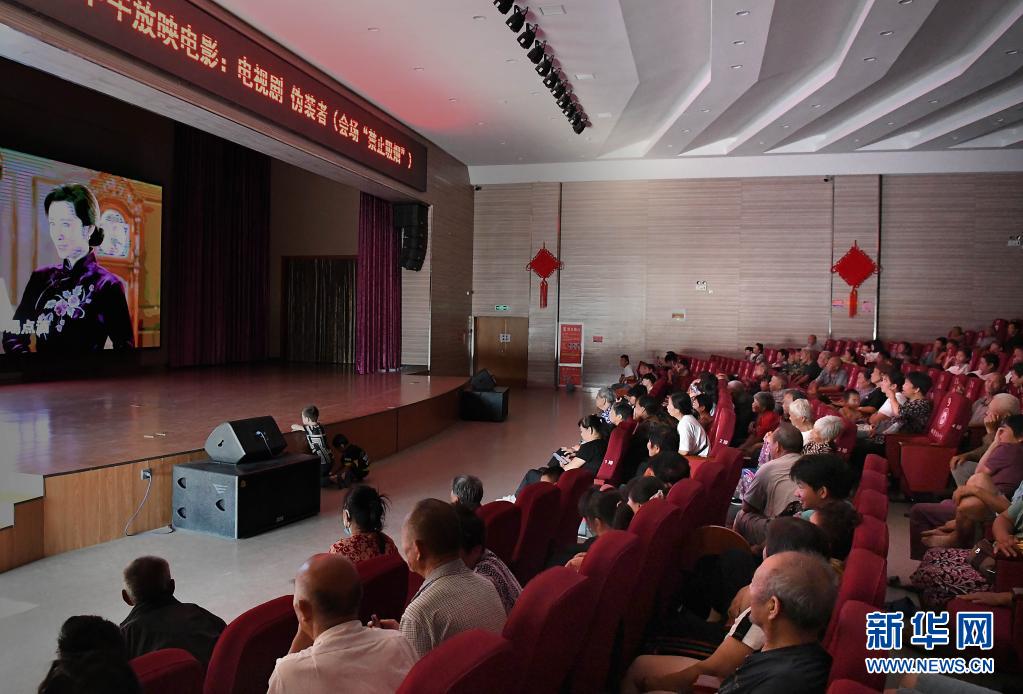 7月29日,在鹤壁市浚县黎阳中学长丰校区安置点,转移群众在礼堂内观看电视剧。