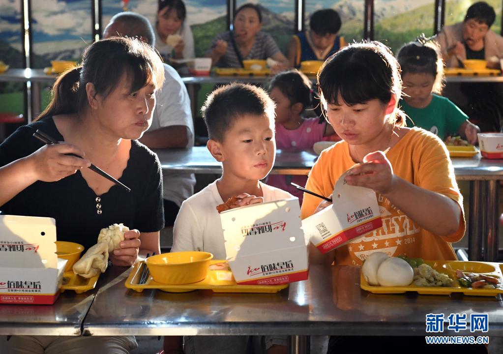 7月29日,转移群众在鹤壁市浚县黎阳中学长丰校区安置点内吃晚饭。