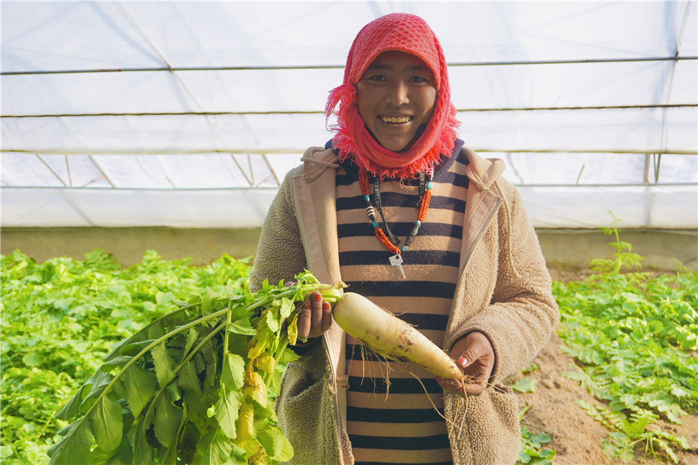西藏阿里改则县日玛村村民央金在改则产业园蔬菜大棚展示收获的蔬菜(2021年3月31日摄)。新华社记者 田金文 摄