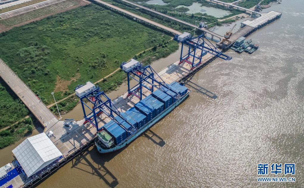 这是8月1日拍摄的阳逻国际港集装箱水铁联运项目码头平台(无人机照片)。新华社发(伍志尊摄)