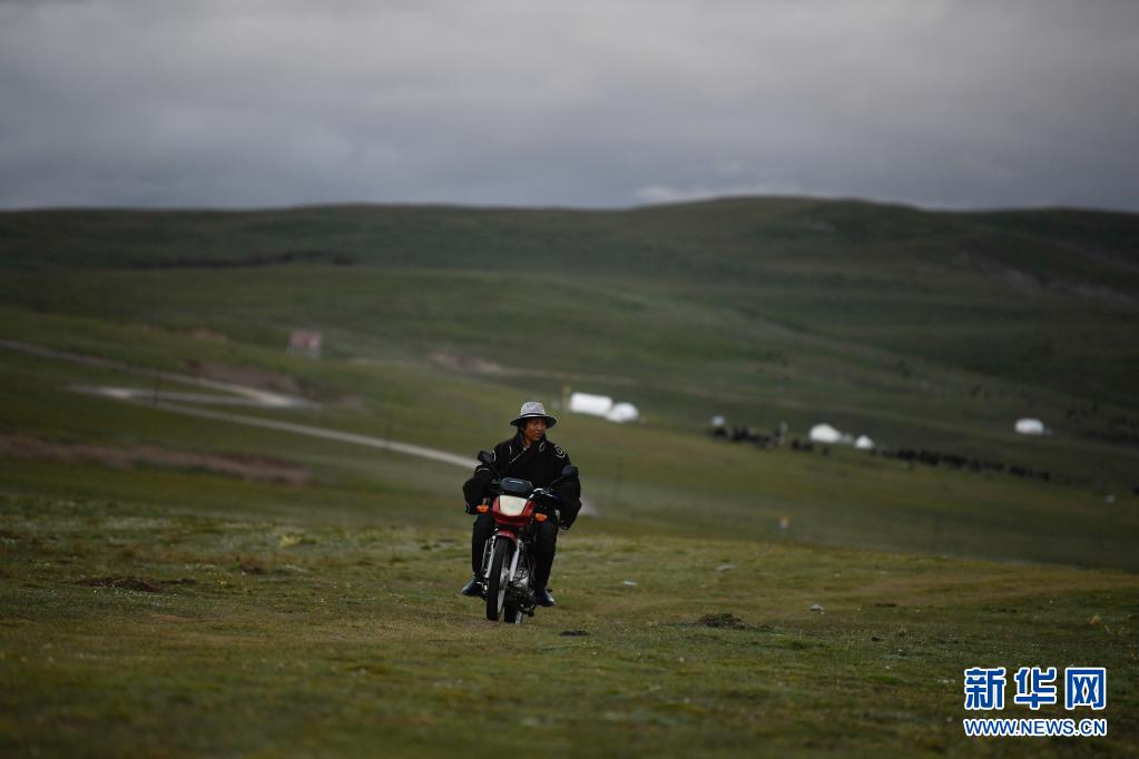 8月3日,在玛沁县当洛乡贡龙村的夏季草场上,牧民骑着摩托车在查看牛羊。