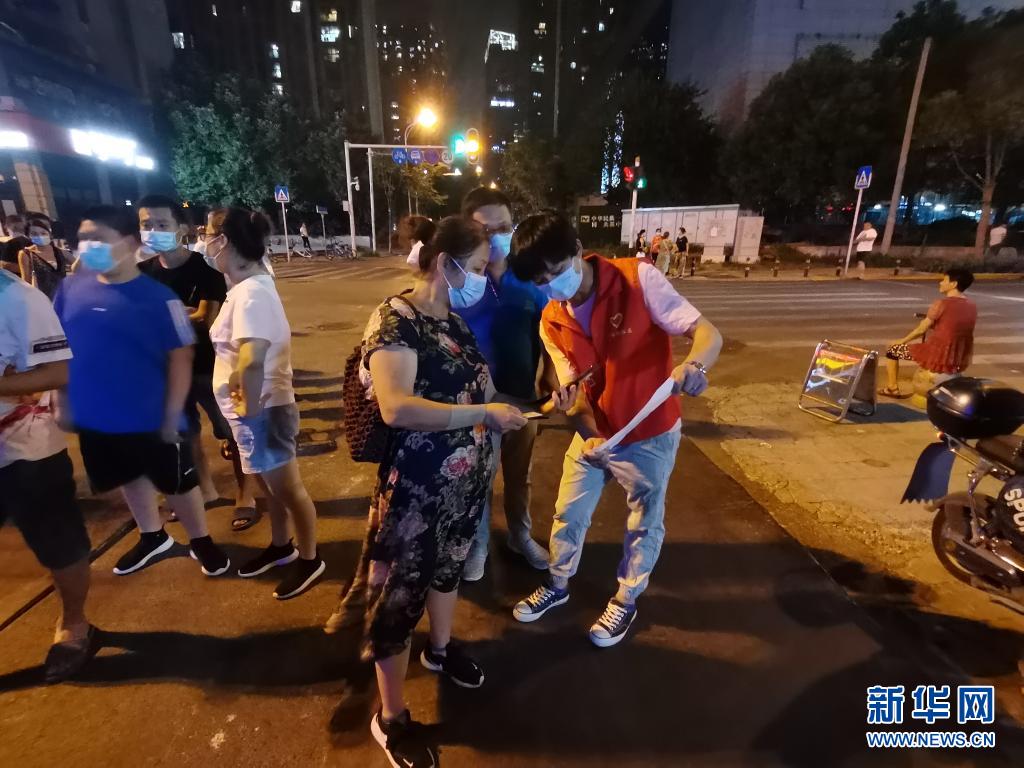 8月3日,志愿者罗文波(前右一)在武汉市汉阳区龙阳社区卫生服务中心核酸采样点帮助居民扫码、填写信息。新华社记者 田中全 摄