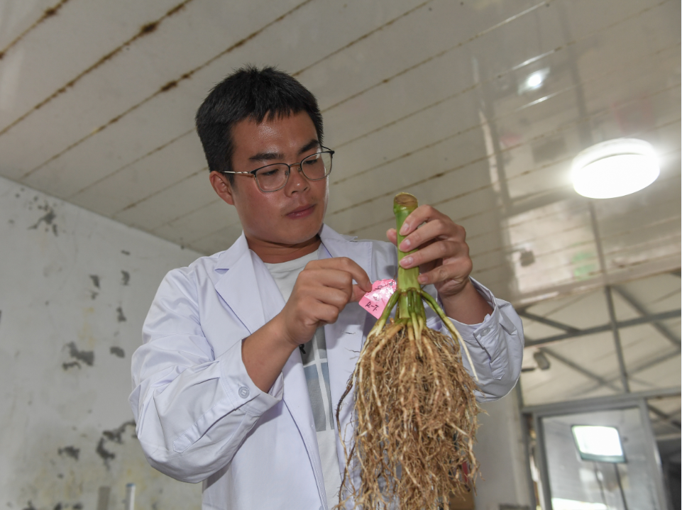 8月2日,沙野在“科技小院”观察玉米根系样本。新华社记者张楠摄