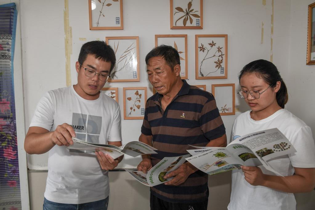 8月2日,在“科技小院”,沙野(左一)和在读硕士郭雯清(右一)为当地农民讲解农业技术。新华社记者张楠摄