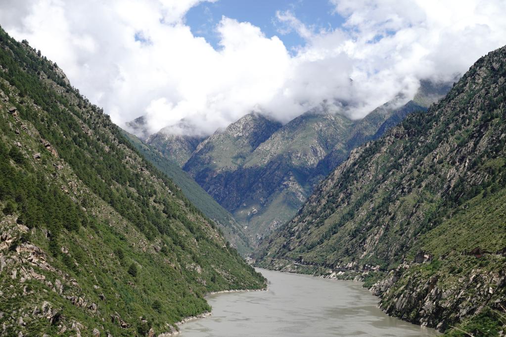 盛夏时节,走近雅鲁藏布江中游的藏木水电站,这里水量丰沛,蓝天白云、漫山青松倒映在碧绿的江水中。