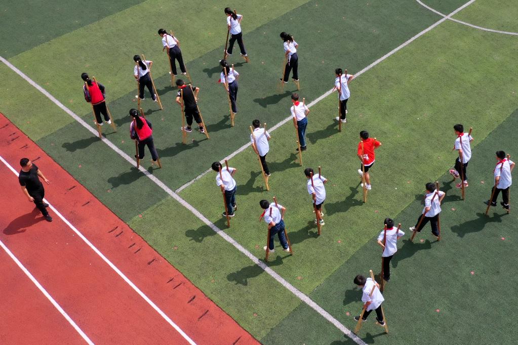 贵州省遵义市余庆县敖溪小学学生在体育课上练习踩高跷(无人机照片,2020年9月10日摄)。新华社记者 刘续 摄
