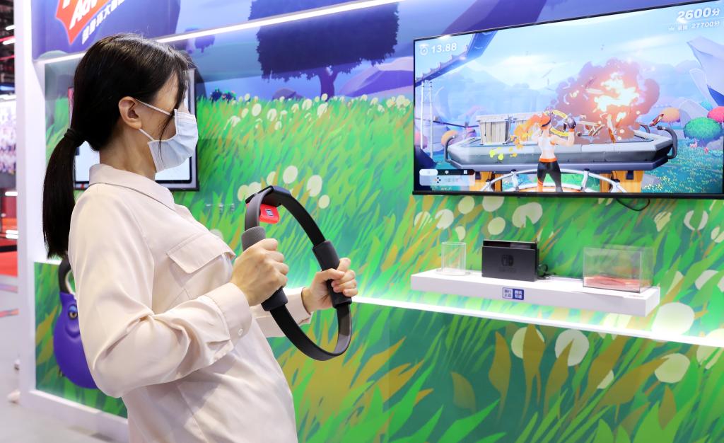 观众在进博会消费品展区的任天堂公司展台体验健身环游戏。新华社记者 方喆 摄